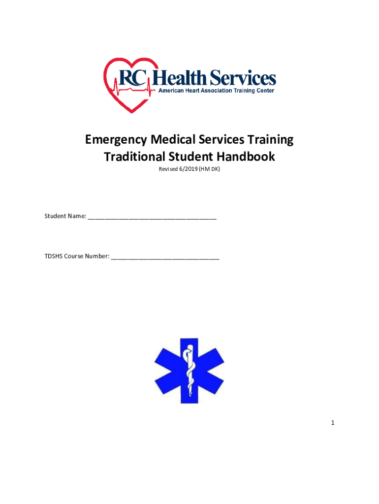 Emergency Medical Services Training Traditional Student Handbook Revised 6/2019 (HM DK)Student Name: ___TDS HS Course Number: ___1RC Health Services is an emergency services training company that