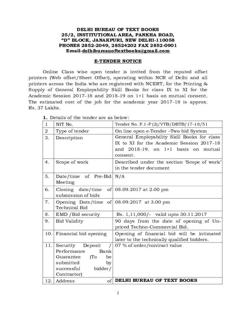 DELHI BUREAU OF TEXT BOOKS 25/2, INSTITUTIONAL AREA, LANKA ROAD, D BLOCK, JAYAPURA, NEW DELHI110058 PHONES 28522049, 28524202 FAX 28520901 Emaildelhibureauoftextbooks@gmail.com TENDER NOTICE Online