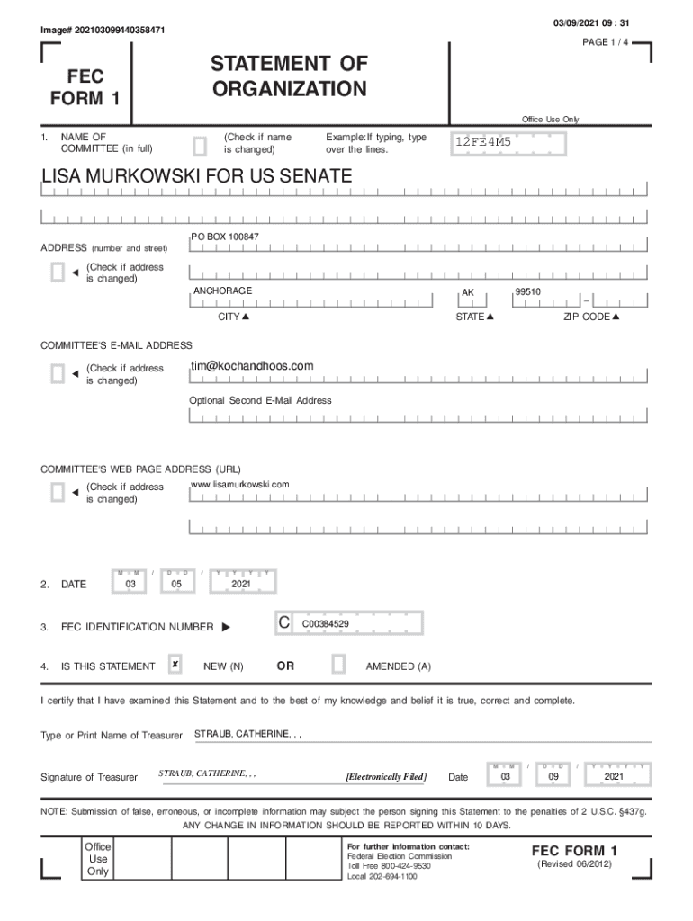 03/09/2021 09 : 31Image# 202103099440358471PAGE 1 / 4STATEMENT OF ORGANIZATION FEC FORM 1Office Use Only1.NAME OF COMMITTEE (in full)Example: If typing, type over the lines.(Check if name is changed)12FE4M5LISA