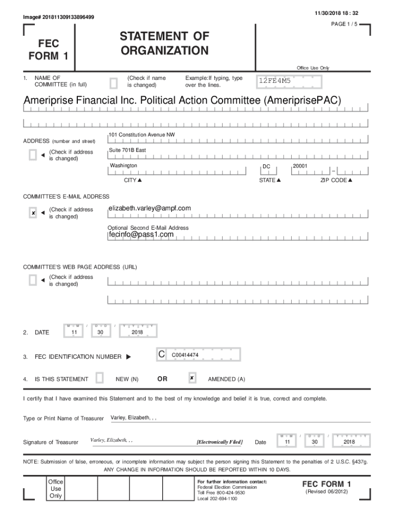 11/30/2018 18 : 32Image# 201811309133896499PAGE 1 / 5STATEMENT OF ORGANIZATION FEC FORM 1Office Use Only1.NAME OF COMMITTEE (in full)Example: If typing, type over the lines.(Check if name is changed)12FE4M5Ameriprise