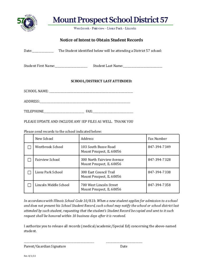 Notice of Intent to Obtain Student Records Date:___The Student identified below will be attending a District 57 school:Student First Name:___Student Last Name:___SCHOOL/DISTRICT LAST ATTENDED: SCHOOL