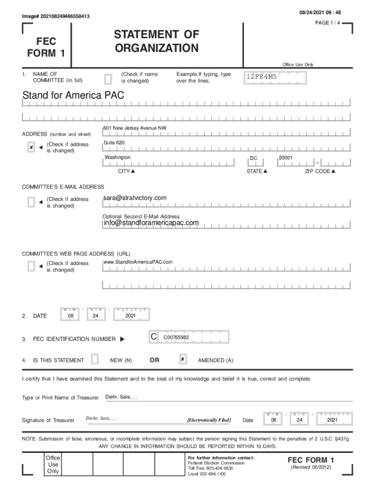 08/24/2021 09 : 48Image# 202108249466558413PAGE 1 / 4STATEMENT OF ORGANIZATION FEC FORM 1Office Use Only1.NAME OF COMMITTEE (in full)Example: If typing, type over the lines.(Check if name is changed)12FE4M5Stand