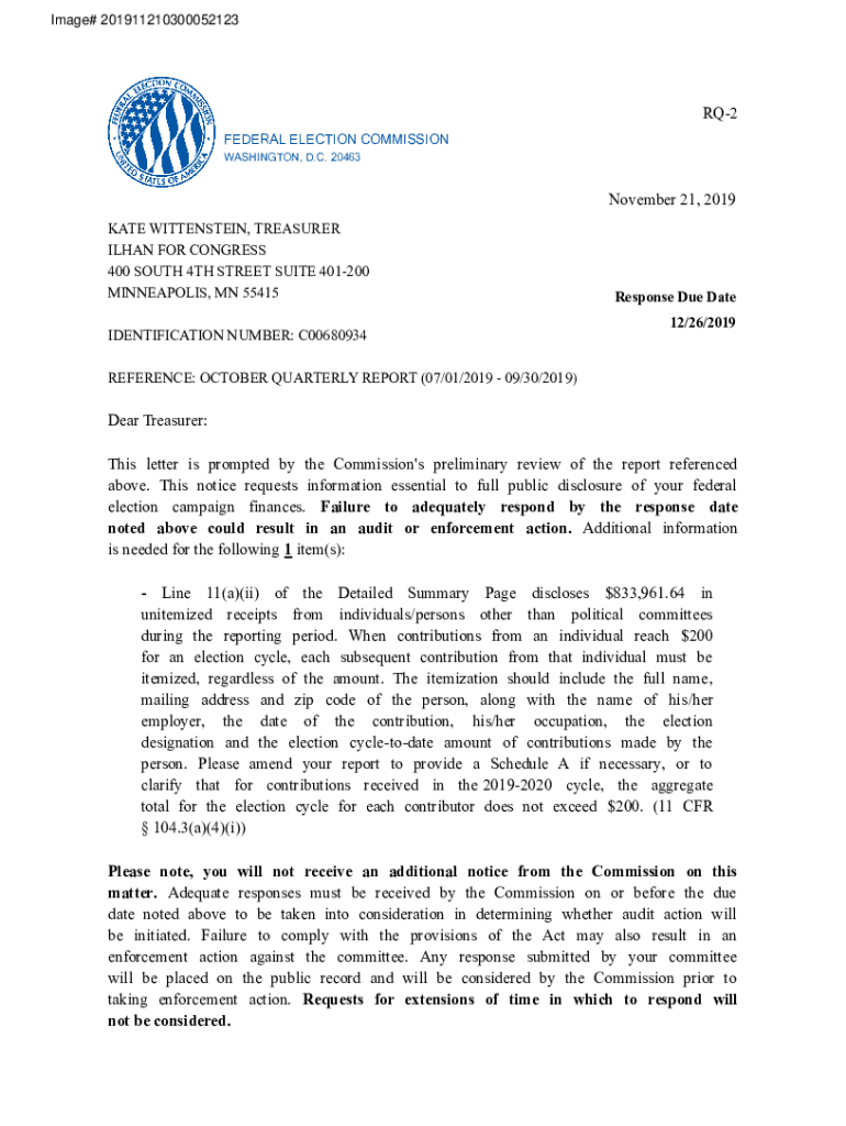 Image# 201911210300052123RQ2 FEDERAL ELECTION COMMISSION WASHINGTON, D.C. 20463November 21, 2019 KATE WITTGENSTEIN, TREASURER THAN FOR CONGRESS 400 SOUTH 4TH STREET SUITE 401200 MINNEAPOLIS, MN 55415