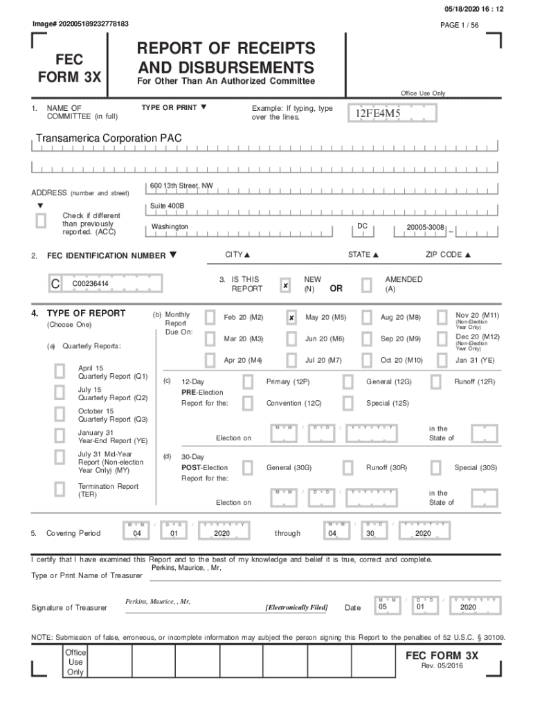 05/18/2020 16 : 12 Image# 202005189232778183PAGE 1 / 56REPORT OF RECEIPTS AND DISBURSEMENTS FEC FORM 3XFor Other Than An Authorized Committee Office Use Only1.NAME OF COMMITTEE (in full)Example:If
