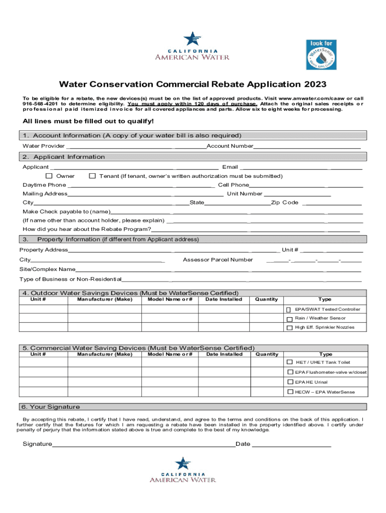 Water Conservation Commercial Rebate Application 2023 To be eligible for a rebate, the new devices(s) must be on the list of approved products. Visit www.amwater.com/caaw or call 9165684201 to determine