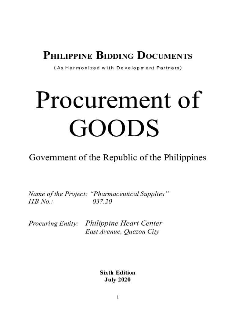 PHILIPPINE BIDDING DOCUMENTS (As H an r m o n i zed w i t h D e v e l o p m e n t Pa r t né rs)Procurement of GOODS Government of the Republic of the PhilippinesName of the Project: Pharmaceutical