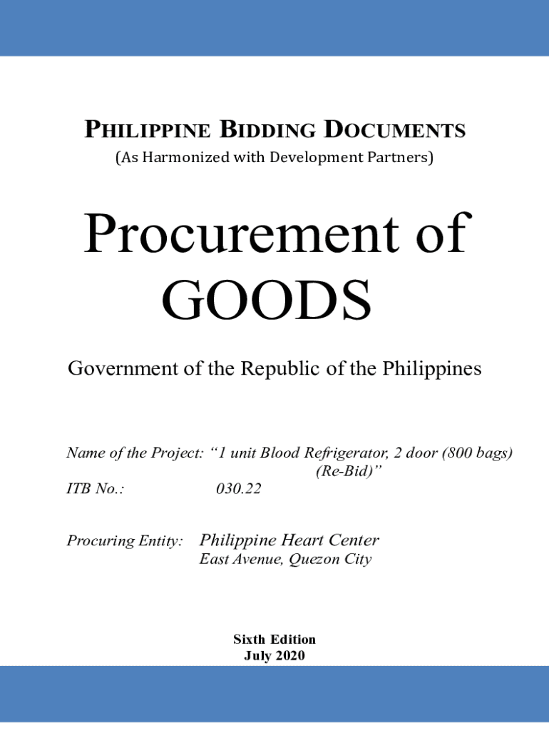 PHILIPPINE BIDDING DOCUMENTS (As Harmonized with Development Partners)Procurement of GOODS Government of the Republic of the PhilippinesName of the Project: 1 unit Blood Refrigerator, 2 doors (800