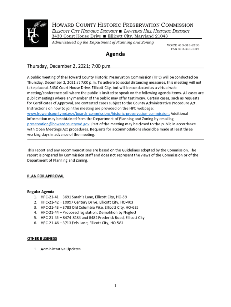 HOWARD COUNTY HISTORIC PRESERVATION COMMISSION ELLICOTT CITY HISTORIC DISTRICT LAWYERS HILL HISTORIC DISTRICT 3430 Court House Drive Ellicott City, Maryland 21043 Administered by the Department of