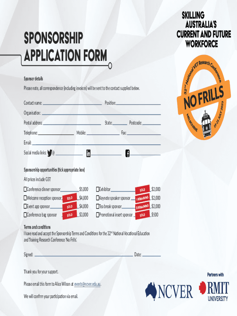 SPONSORSHIP OPPORTUNITIES32nd National Vocational Education and Training Research ConferencePresented supported byte focus of the No Frills 2023 program is Training Australia's current and future