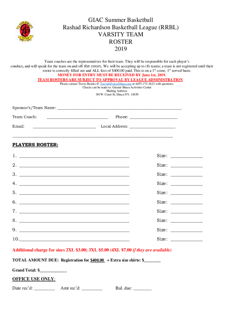 GMAC Summer Basketball Rashad Richardson Basketball League (RRL) VARSITY TEAM ROSTER 2019 Team coaches are the representatives for their team. They will be responsible for each player's conduct, and