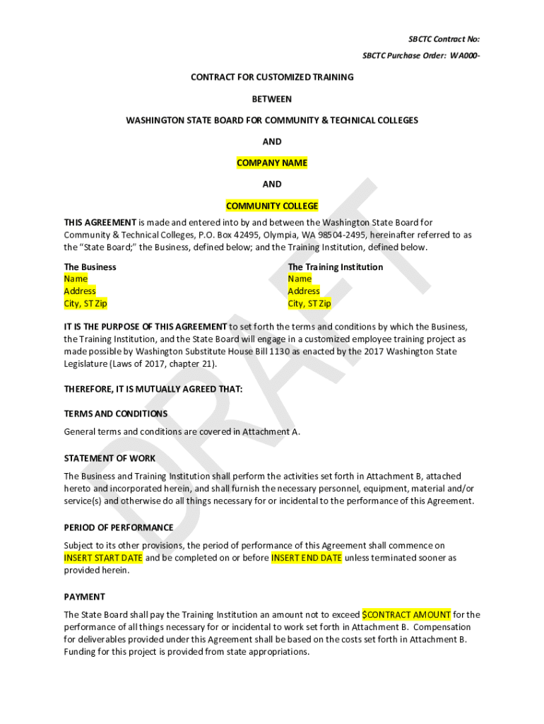 SB CTC Contract No: SB CTC Purchase Order: WA000CONTRACT FOR CUSTOMIZED TRAINING BETWEEN WASHINGTON STATE BOARD FOR COMMUNITY & TECHNICAL COLLEGES AND COMPANY NAME AND COMMUNITY COLLEGE THIS AGREEMENT
