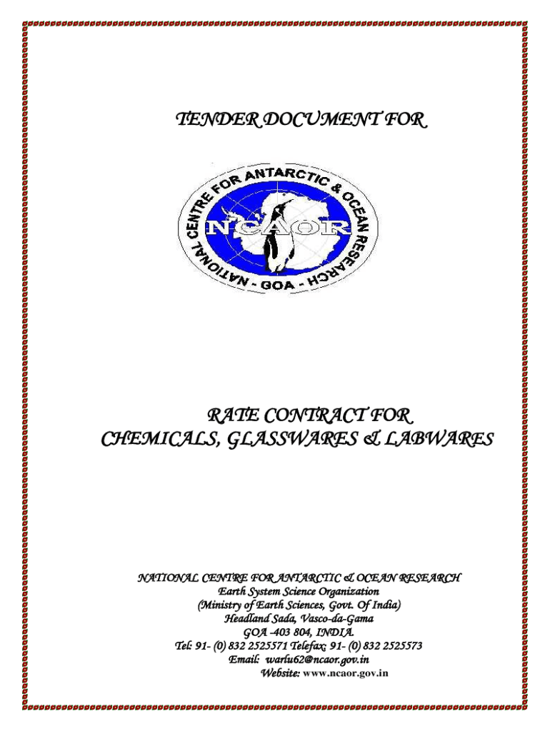 TENDER DOCUMENT FORMAT CONTRACT FOR CHEMICALS, GLASSWARE & LABWARESNATIONAL Center FOR ANTARCTIC & OCEAN RESEARCH Earth System Science Organization (Ministry of Earth Sciences, Govt. Of India) Headland