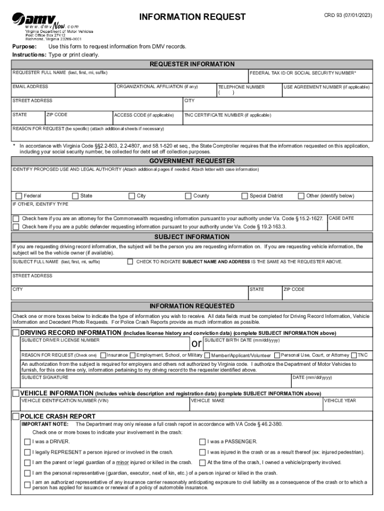 INFORMATION REQUEST CRD 93 (07/01/2023)Purpose: Use this form to request information from DMV records. Instructions: Type or print clearly. REQUESTER INFORMATION REQUESTER FULL NAME (last, first,