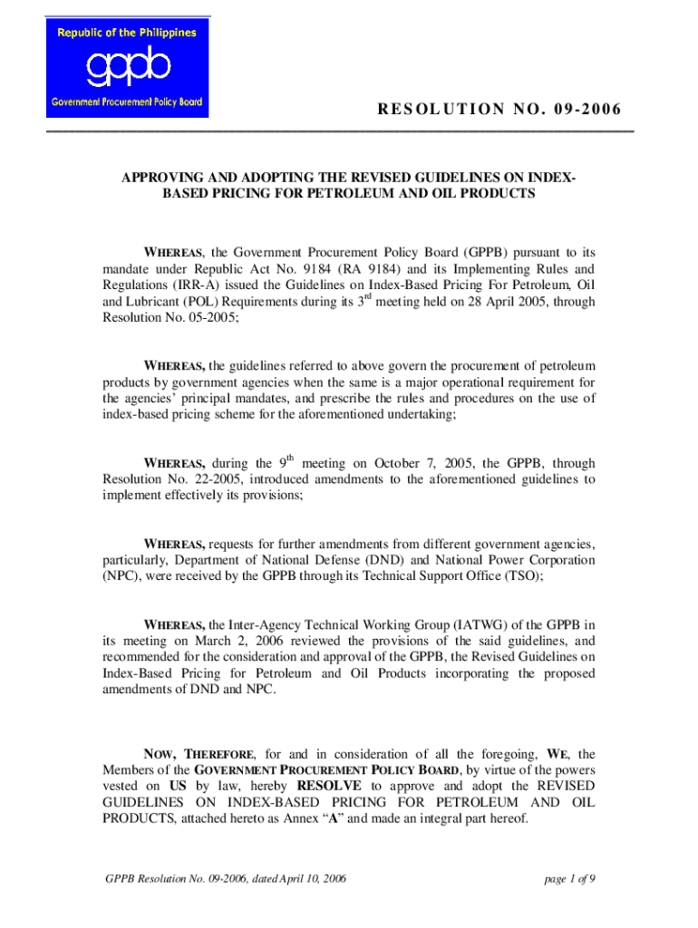 RESOLUTION NO. 092006 ___APPROVING AND ADOPTING THE REVISED GUIDELINES ON INDEXED PRICING FOR PETROLEUM AND OIL PRODUCTSWHEREAS, the Government Procurement Policy Board (PPB) pursuant to its mandate