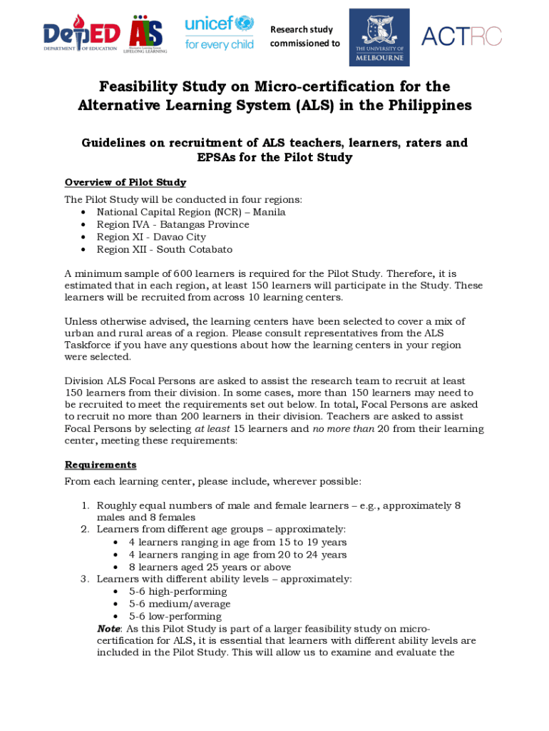 Guidelines on recruitment of ALS teachers, learners, raters and