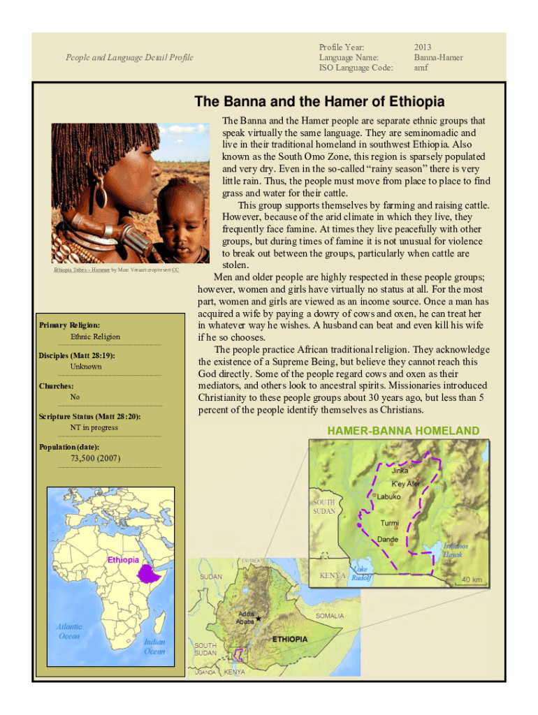 People and Language Detail ProfileProfile Year: Language Name: ISO Language Code:2013 BannaHamer Agathe Anna and the Hammer of Ethiopia Tribes Hammer by Marc Vera art crop/revert Primary Religion: