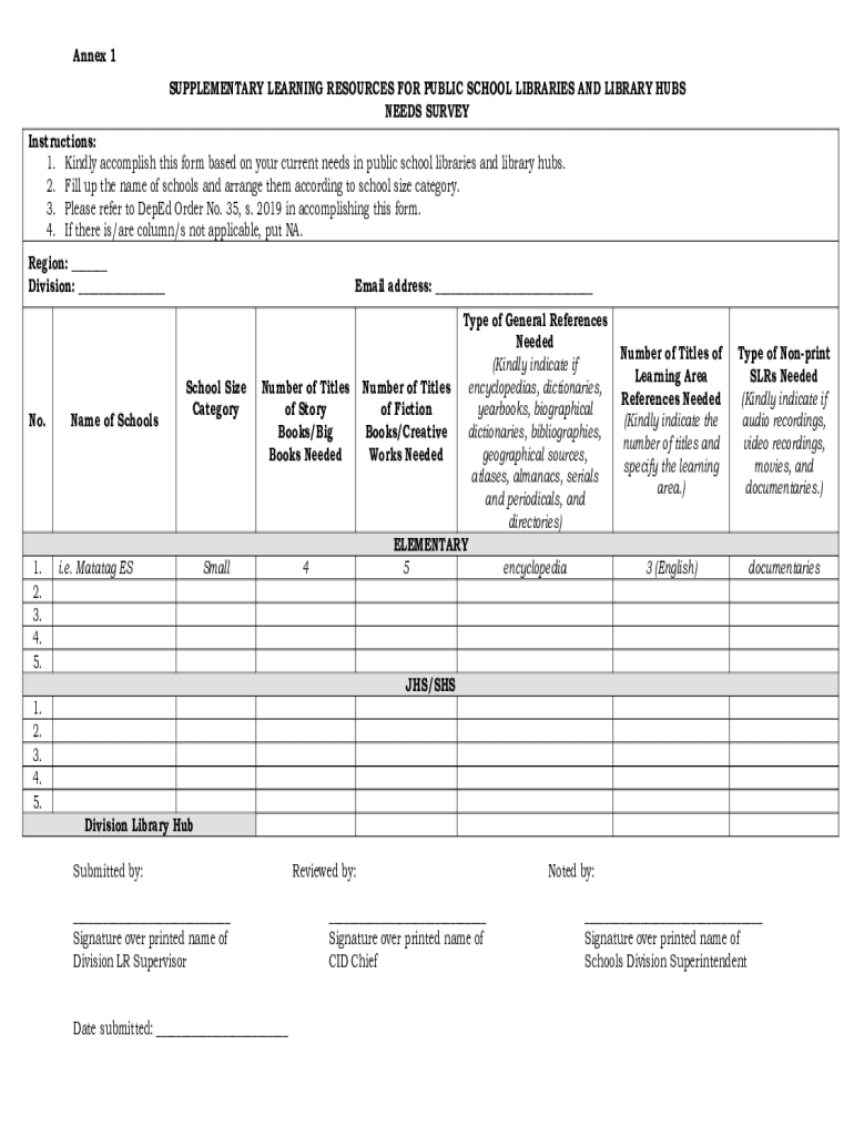 Annex 1 SUPPLEMENTARY LEARNING RESOURCES FOR PUBLIC SCHOOL LIBRARIES AND LIBRARY HUBS NEEDS SURVEY Instructions: 1. Kindly accomplish this form based on your current needs in public school libraries