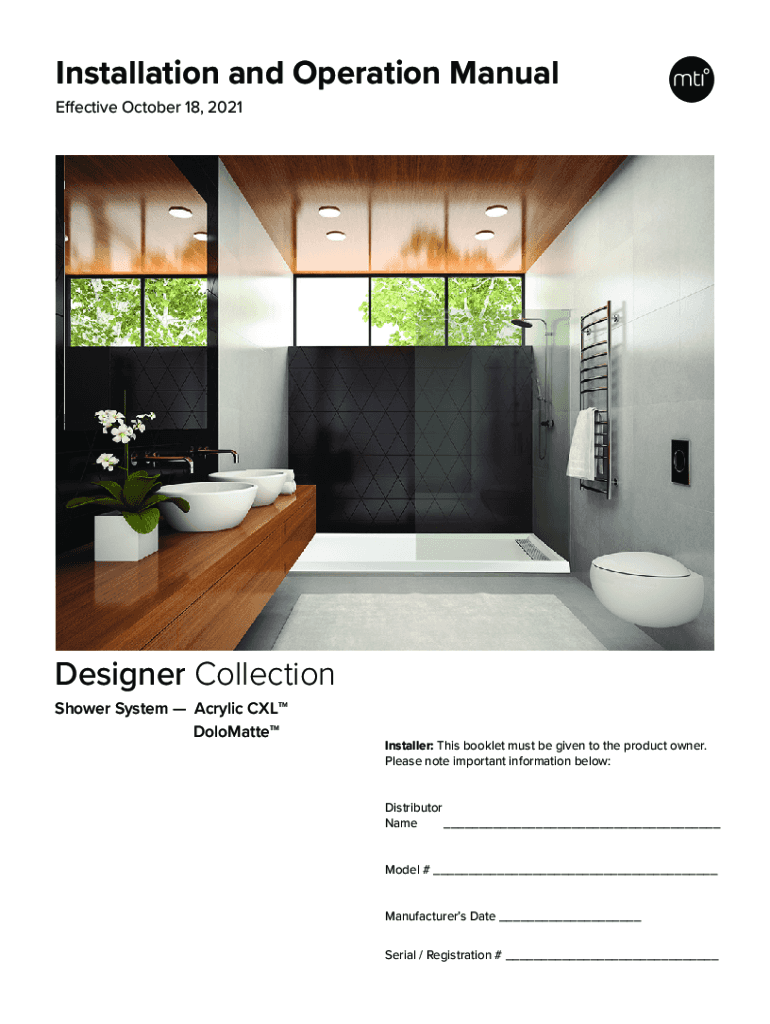 Installation and Operation Manual Effective October 18, 2021Designer Collection Shower System Acrylic CXLTMDoloMatteTMInstaller: This booklet must be given to the product owner. Please note important
