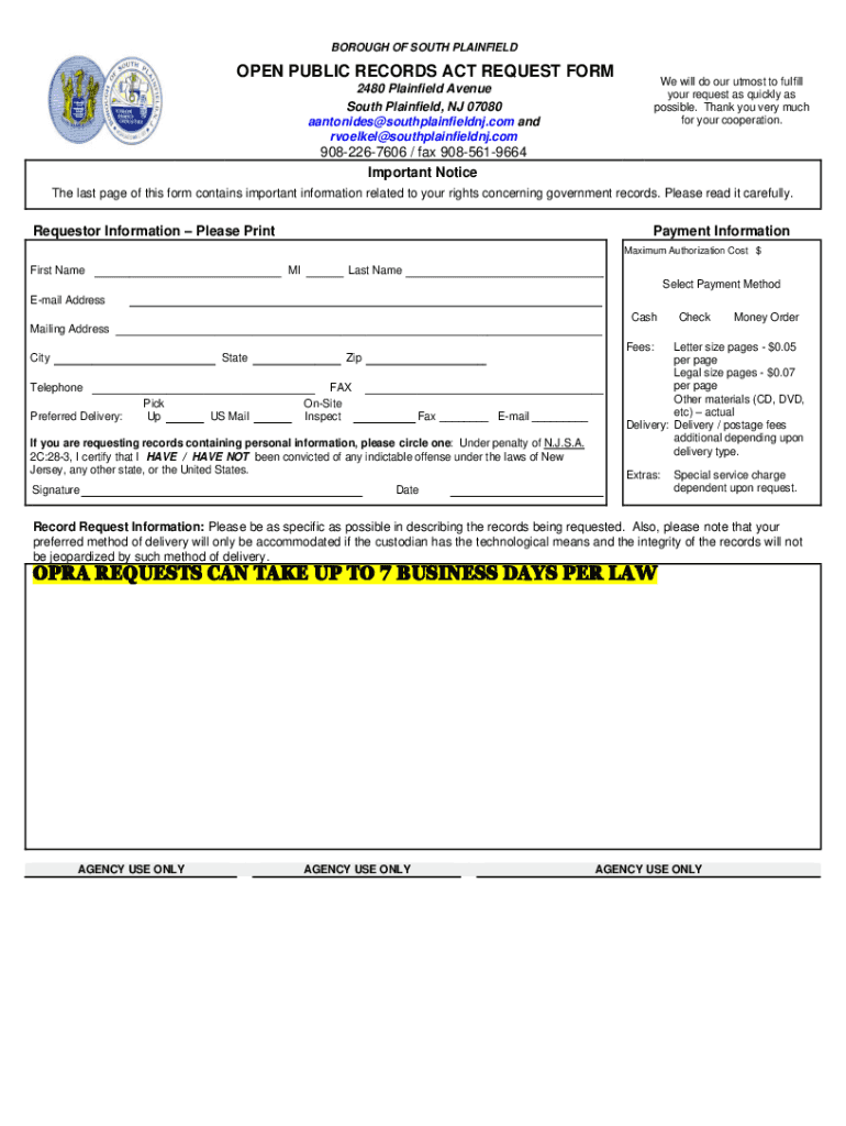 BOROUGH OF SOUTH PLAINFIELDOPEN PUBLIC RECORDS ACT REQUEST Form will do our utmost to fulfill your request as quickly as possible. Thank you very much for your cooperation.2480 Plainfield Avenue South