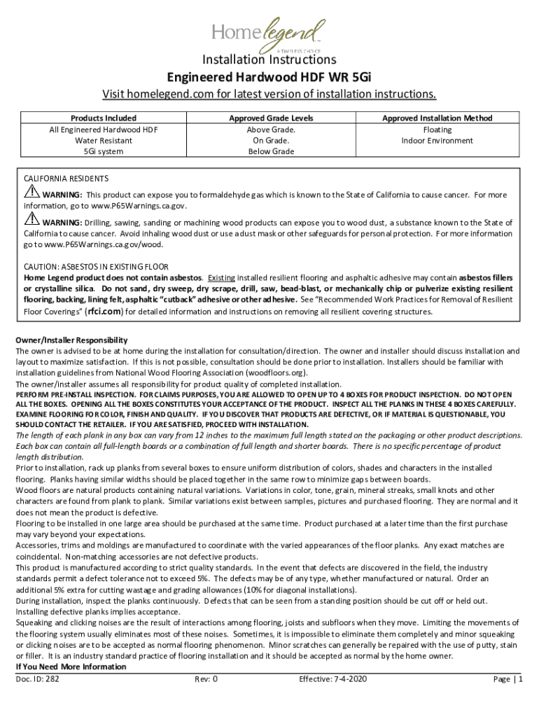 Installation Instructions Engineered Hardwood HDF WR 5GiVisit homelegend.com for latest version of installation instructions. Products Included All Engineered Hardwood HDF Water Resistant 5Gi systemApproved