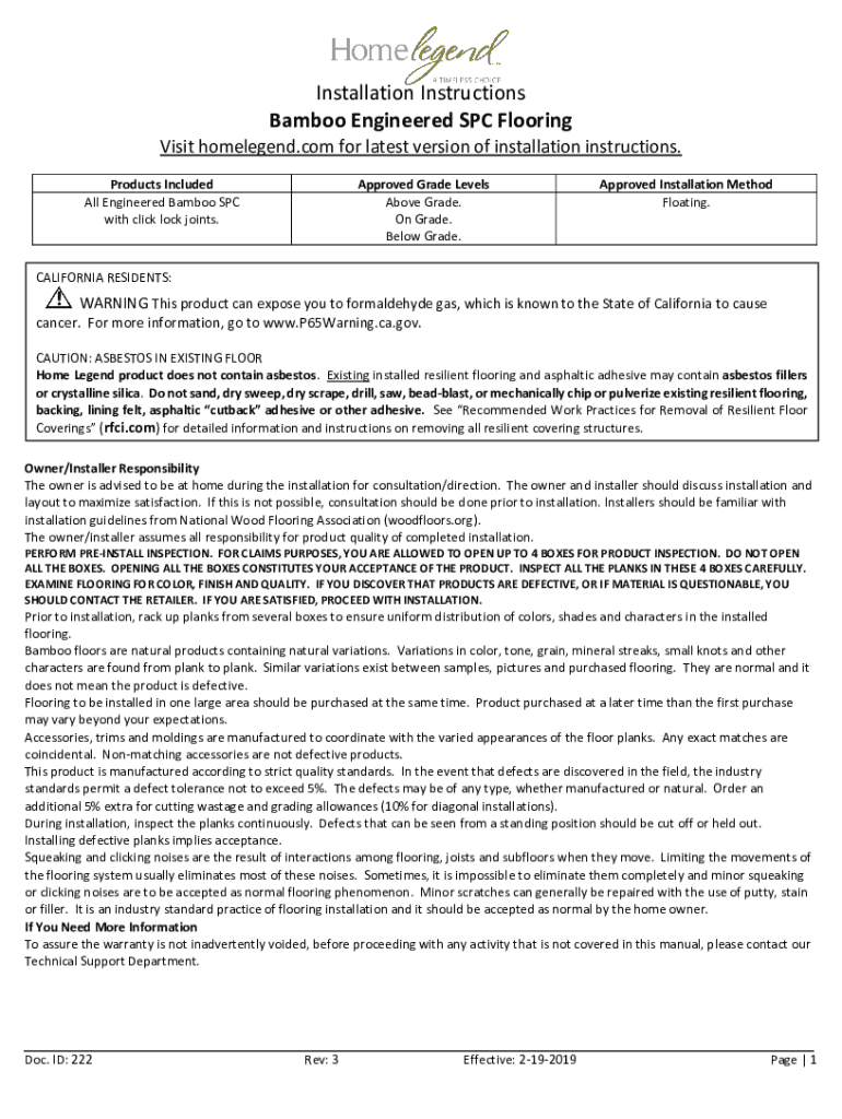 Installation Instructions Bamboo Engineered SPC FlooringVisit homelegend.com for latest version of installation instructions. Products Included All Engineered Bamboo SPC with click lock joints. Approved