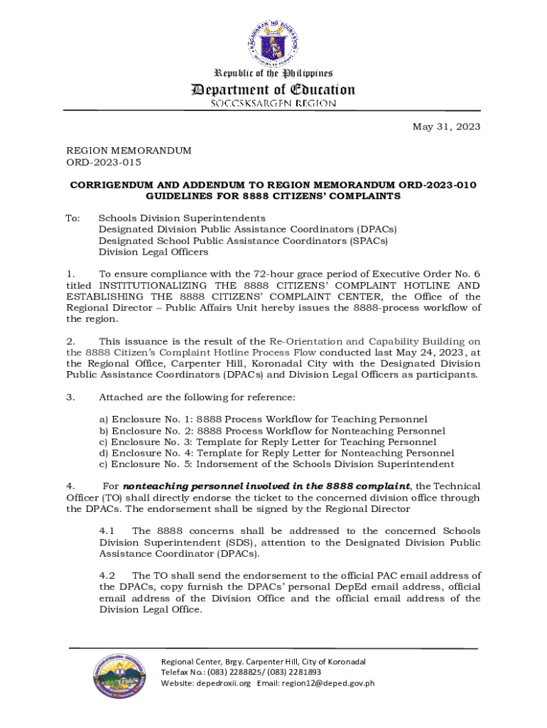 Republic of the PhilippinesDepartment of Education May 31, 2023, REGION MEMORANDUM ORD2023015 CORRIGENDUM AND ADDENDUM TO REGION MEMORANDUM ORD2023010 GUIDELINES FOR 8888 CITIZENS COMPLAINTS To:Schools