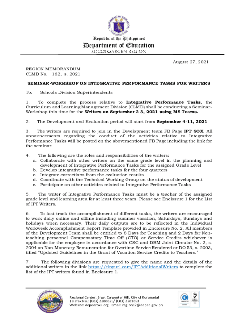 Republic of the PhilippinesDepartment of Education August 27, 2021, REGION MEMORANDUM CLAD No. 162, s. 2021 SEMINARWORKSHOP ON INTEGRATIVE PERFORMANCE TASKS FOR WRITERS To:Schools Division Superintendents1.