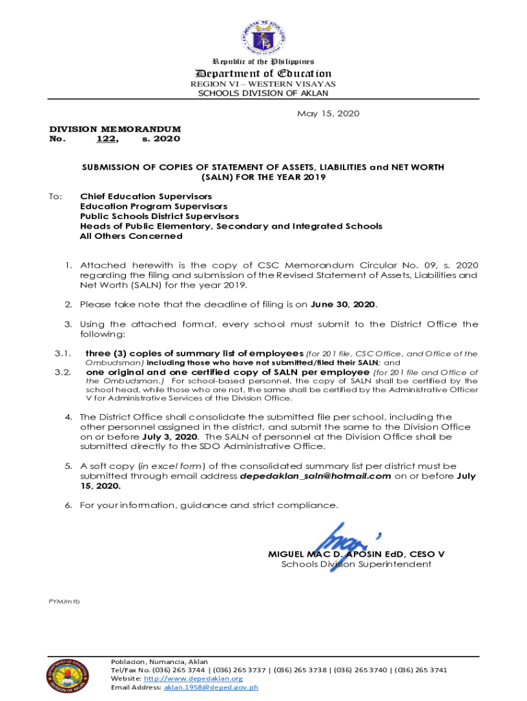 Republic of the PhilippinesDepartment of Education REGION VI WESTERN VISAYANS SCHOOLS DIVISION OF Atlanta 15, 2020 DIVISION MEMORANDUM No. 122, s. 2020 SUBMISSION OF COPIES OF STATEMENT OF ASSETS,