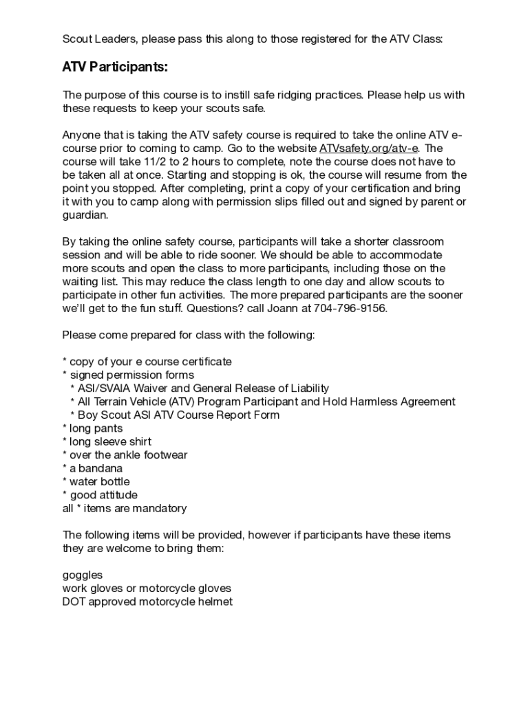 Scout Leaders, please pass this along to those registered for the ATV Class:ATV Participants: The purpose of this course is to instill safe ridging practices. Please help us with these requests to