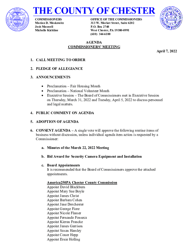 THE COUNTY OF CHESTER COMMISSIONERS Marian D. Moskovitz Josh Maxwell Michelle KichlineOFFICE OF THE COMMISSIONERS 313 W. Market Street, Suite 6202 P.O. Box 2748 West Chester, PA 193800991 (610) 3446100AGENDA