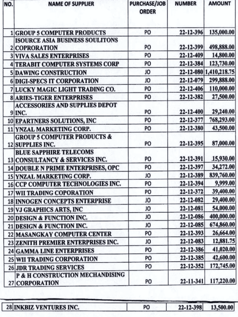 NO.NAME OF SUPPUERPURCHASE/JOB ORDERNUMBERAMOUNT135,000.001 GROUP 5 COMPUTER PRODUCTS SOURCE ASIA BUSINESS SOLUTIONS 2 CORPORATION 3 VIVA SALES ENTERPRISES 4 TERABIT COMPUTER SYSTEMS CORP 5 DATING