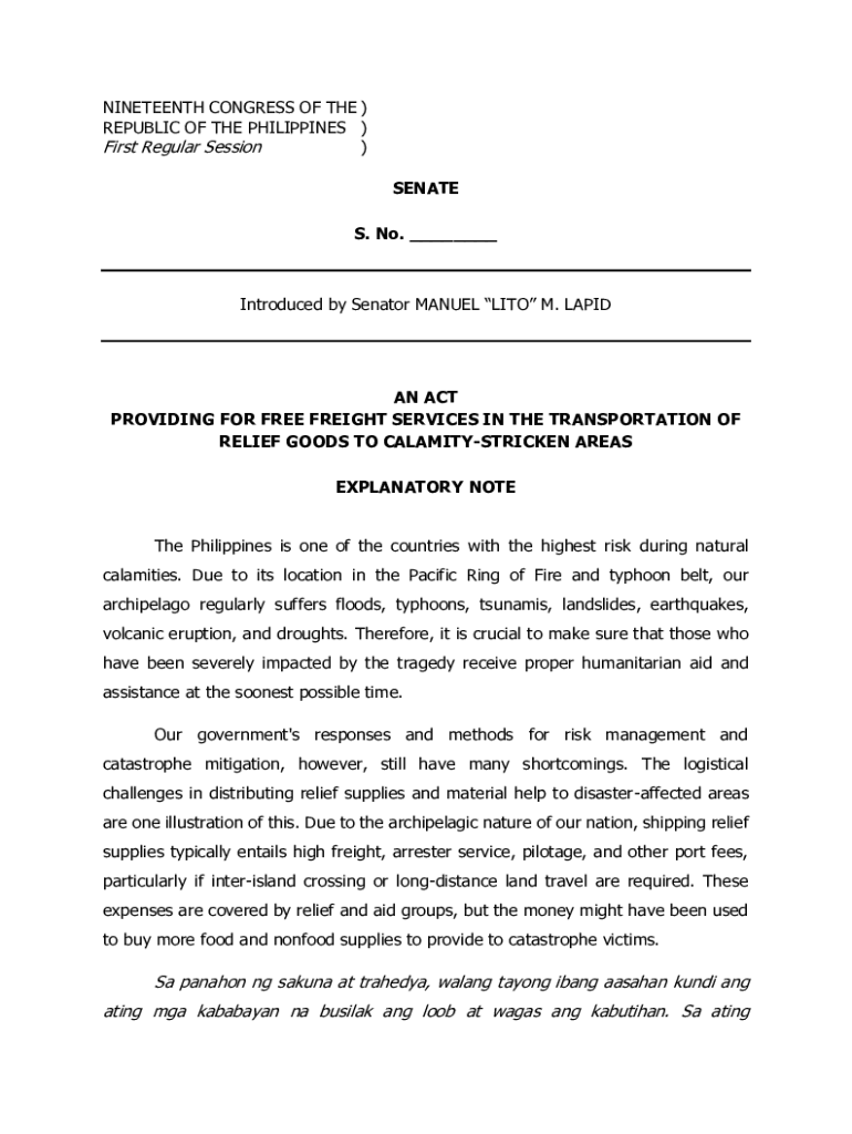 NINETEENTH CONGRESS OF THE) REPUBLIC OF THE PHILIPPINES) First Regular Session) SENATE S. No. ___Introduced by Senator MANUEL TITO M. LAPIDARY ACT PROVIDING FOR FREE FREIGHT SERVICES IN THE TRANSPORTATION