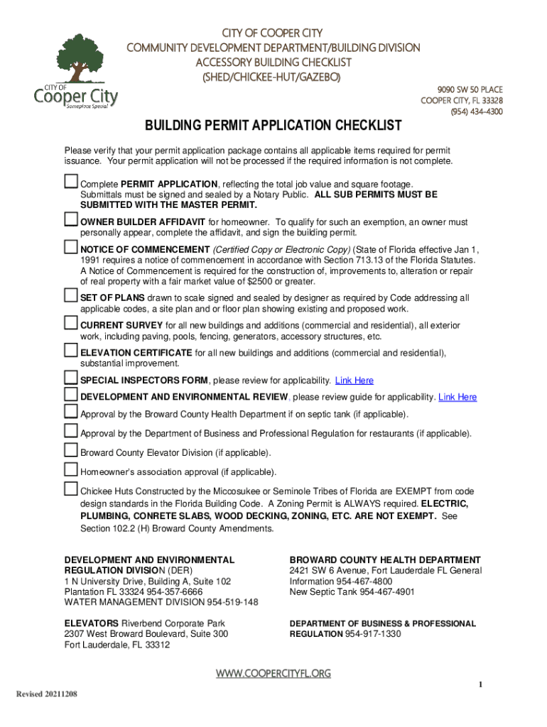 CITY OF COOPER CITY COMMUNITY DEVELOPMENT DEPARTMENT/BUILDING DIVISION ACCESSORY BUILDING CHECKLIST (SHED/CHICKENSHIT/GAZEBO) 9090 SW 50 PLACE COOPER CITY, FL 33328 (954) 4344300BUILDING PERMIT APPLICATION