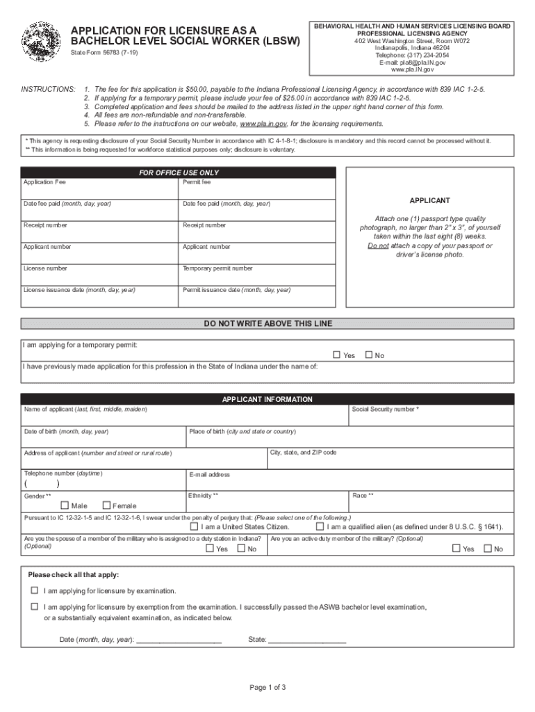 Reset Formalization FOR LICENSURE AS A BACHELOR LEVEL SOCIAL WORKER (LBS) State Form 56783 (719)INSTRUCTIONS:1. 2. 3. 4. 5.BEHAVIORAL HEALTH AND HUMAN SERVICES LICENSING BOARD PROFESSIONAL LICENSING