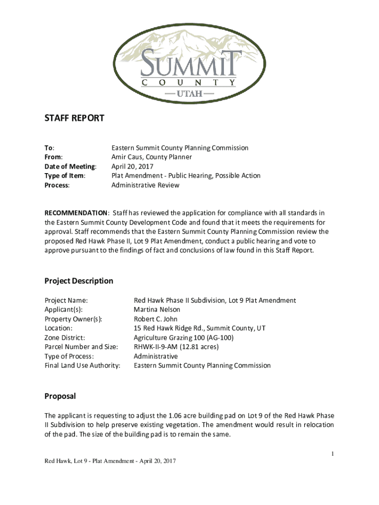 STAFF REPORT To: From: Date of Meeting: Type of Item: Process:Eastern Summit County Planning Commission Amir Cars, County Planner April 20, 2017, Plat Amendment Public Hearing, Possible Action Administrative