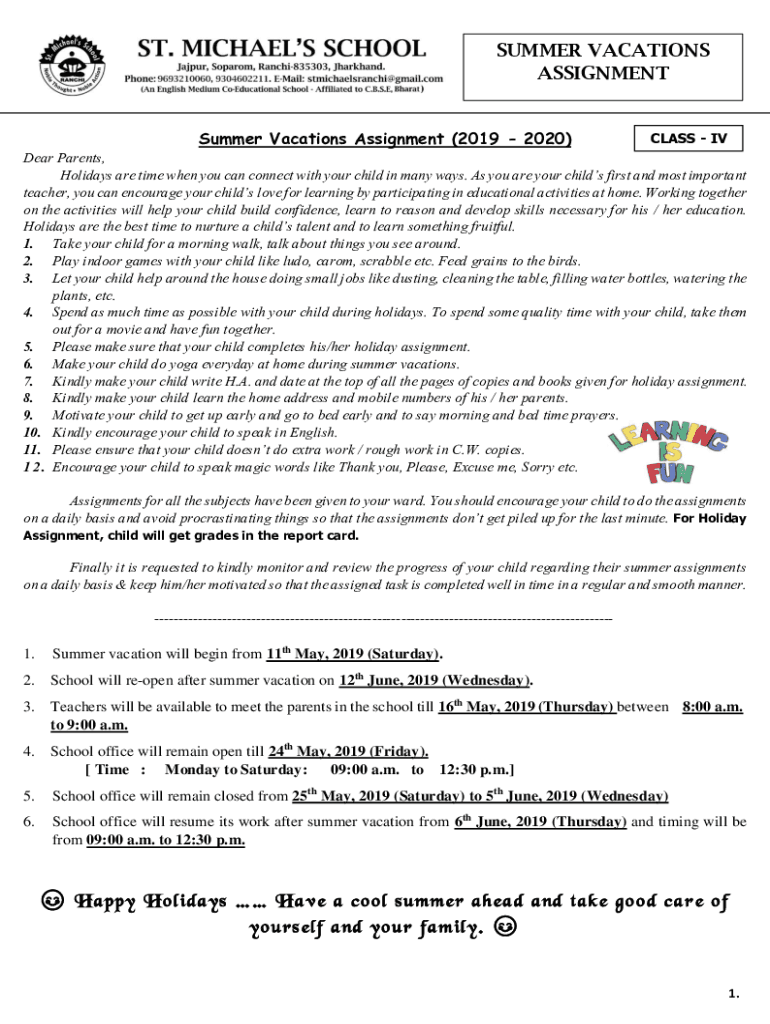 SUMMER VACATIONS ASSIGNMENT Summer Vacations Assignment (2019 2020)CLASS IVD ear Parents, Holidays are time when you can connect with your child in many ways. As you are your children first and most