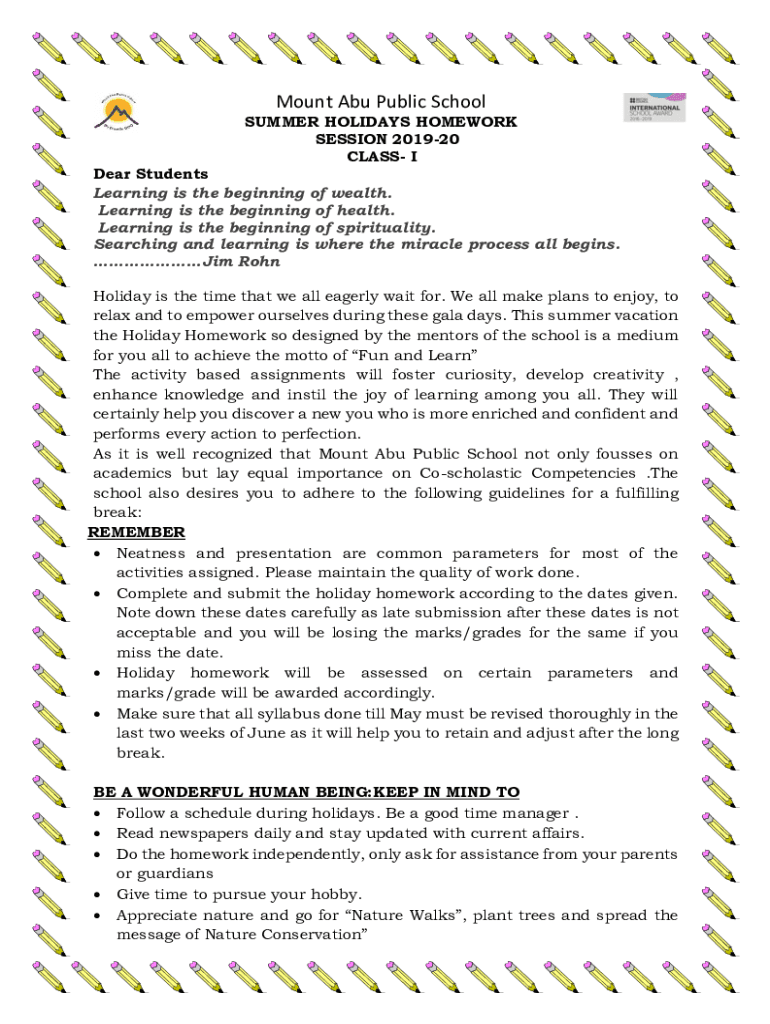 Mount Abu Public School SUMMER HOLIDAYS HOMEWORK SESSION 201920 CLASS I Dear Students Learning is the beginning of wealth. Learning is the beginning of health. Learning is the beginning of spirituality.