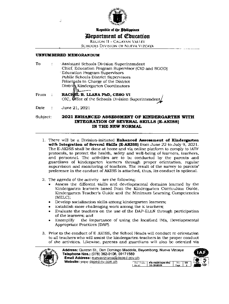SCHOOLS DIVISION OF NEVA VIZCAYAUNNUMBERED MEMORANDUMToAssistant Schools Division Superintendent