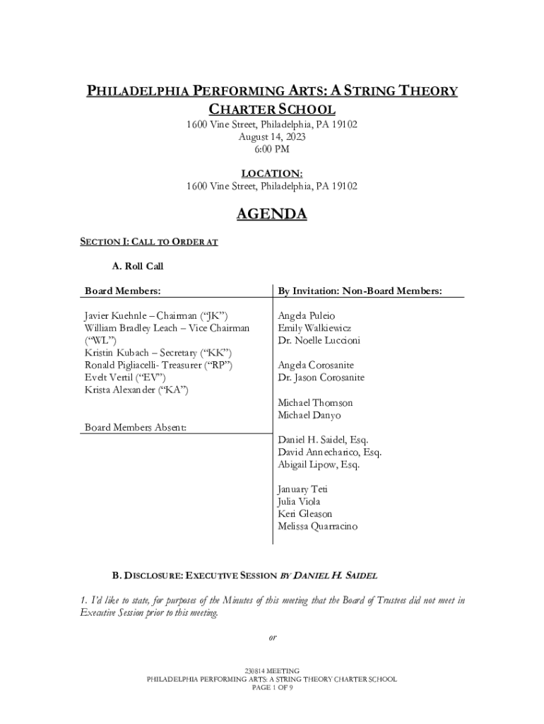 PHILADELPHIA PERFORMING ARTS: A STRING THEORY CHARTER SCHOOL 1600 Vine Street, Philadelphia, PA 19102 August 14, 2023 6:00 PM LOCATION: 1600 Vine Street, Philadelphia, PA 19102AGENDA SECTION I: CALL