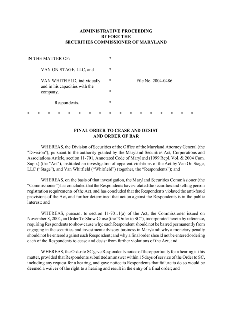ADMINISTRATIVE PROCEEDING BEFORE THE SECURITIES COMMISSIONER OF MARYLAND THE MATTER OF:*VAN ON STAGE, LLC, and×VAN WHITFIELD, individually and in his capacities with the company, ×Respondents. ******File