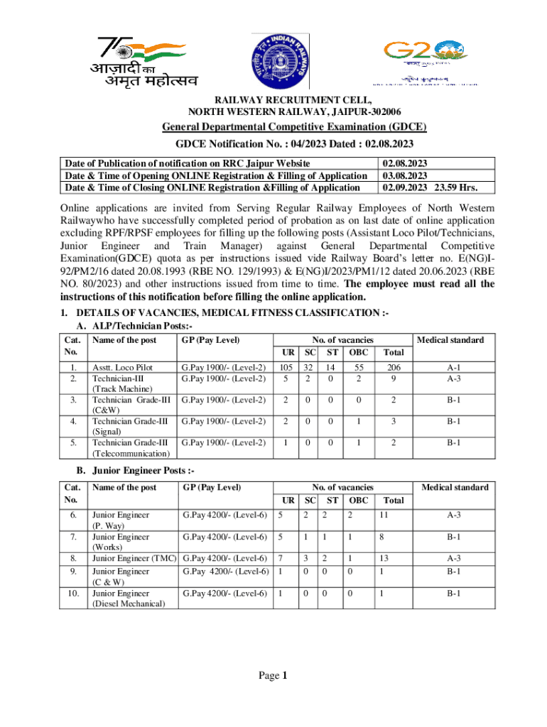 RAILWAY RECRUITMENT CELL, NORTH WESTERN RAILWAY, JAIPUR302006General Departmental Competitive Examination (DCE) DCE Notification No. 04/2023 Dated : 02.08.2023 Date of Publication of notification