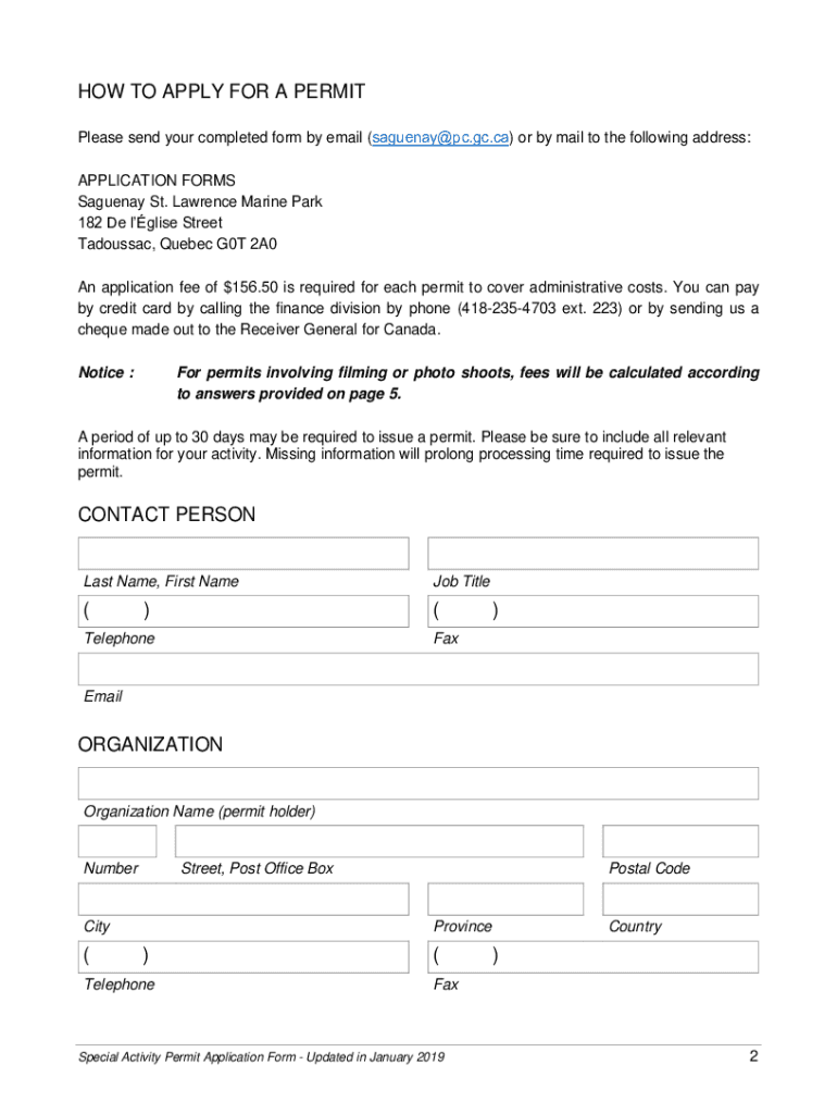 MARINE ACTIVITIES IN THE SAGUENAY ST. LAWRENCE MARINE PARK REGULATIONSPERMIT APPLICATION FORM Special ActivityABOUT THIS FORM This permit is required to operate within the boundaries of the Saguenay