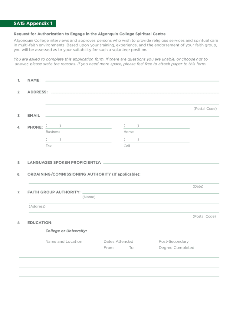 SA15 Appendix 1 Request for Authorization to Engage in the Algonquin College Spiritual Center Algonquin College interviews and approves persons who wish to provide religious services and spiritual