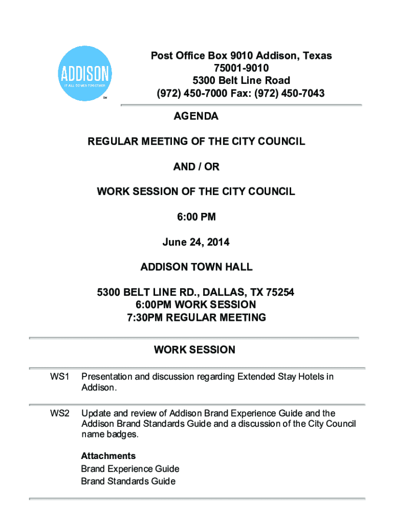 Post Office Box 9010 Addison, Texas 750019010 5300 Belt Line Road (972) 4507000 Fax: (972) 4507043 AGENDA REGULAR MEETING OF THE CITY COUNCIL AND / OR WORK SESSION OF THE CITY COUNCIL 6:00 PM June