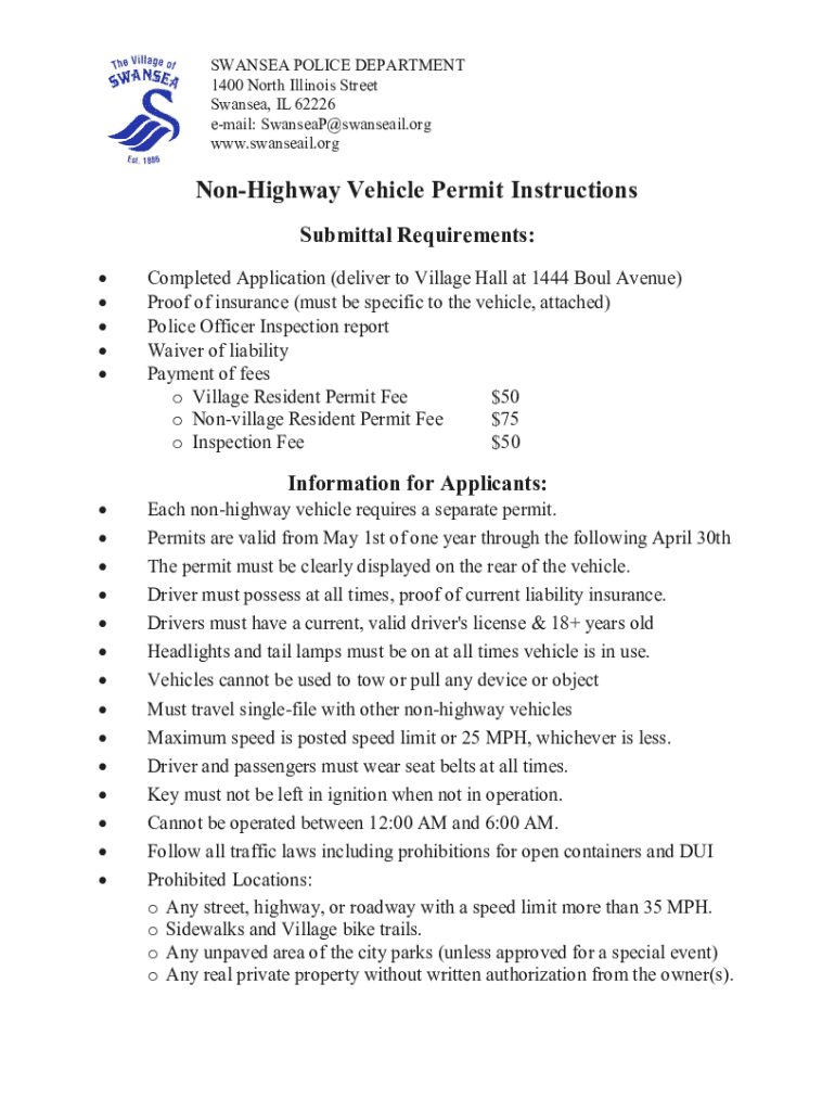 SWANSEA POLICE DEPARTMENT 1400 North Illinois Street Swansea, IL 62226 email: SwanseaP@swanseail.org www.swanseail.orgNonHighway Vehicle Permit Instructions Submittal Requirements: Completed Application