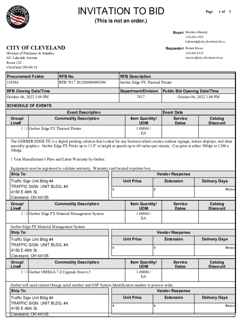 INVITATION TO BIDPage1 of3(This is not an order.) Buyer: Kristina Ahmet 2166642885 kahmetaj@city.cleveland.oh.usCITY OF CLEVELANDRequestor: Robert Maven 2166646135 rmavec@city.cleveland.oh.usDivision