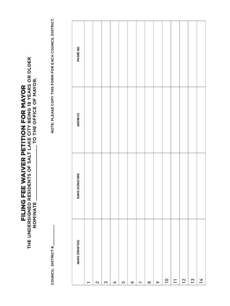 1413121110987654321NAME (PRINTED)COUNCIL DISTRICT #___NAME SIGNATUREADDRESSPHONE NO.NOTE: PLEASE COPY THIS FORM FOR EACH COUNCIL DISTRICT.THE UNDERSIGNED RESIDENTS OF SALT LAKE CITY BEING 18 YEARS