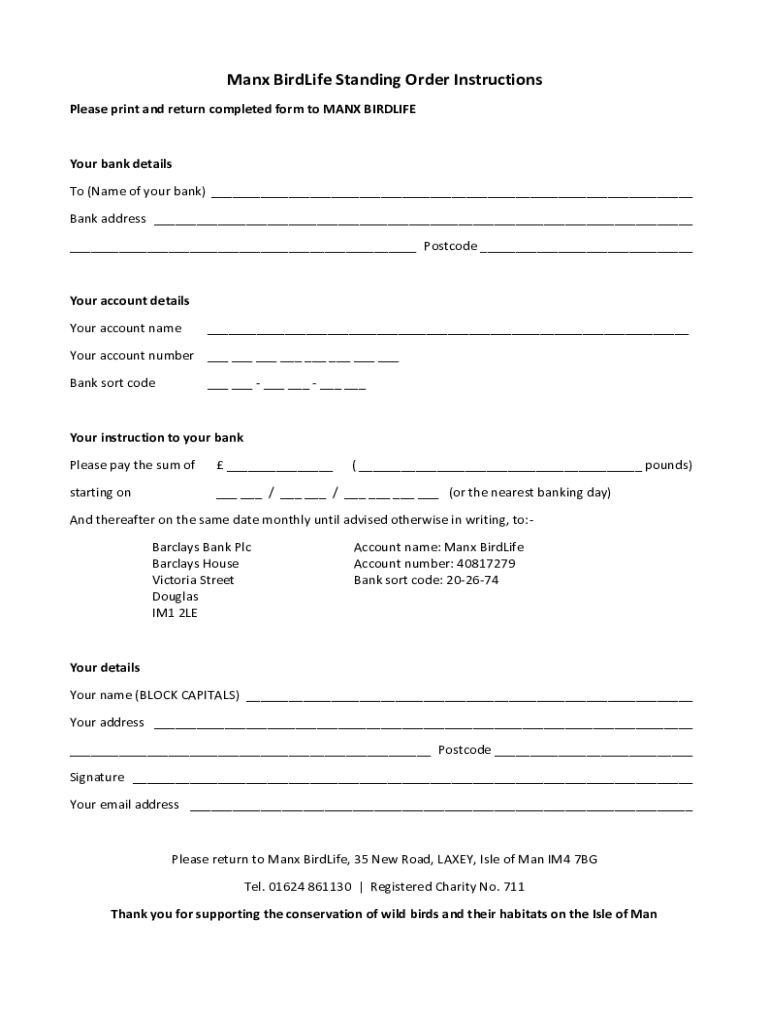Manx BirdLife Standing Order Instructions Please print and return completed form to MANX BIRDLIFEYour bank details To (Name of your bank) ___ Bank address ___ ___ Postcode ___Your account details
