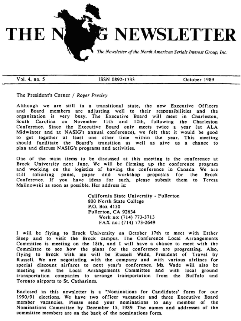 NEWSLETTER The Newsletter of the North American Serials Interest Group, Inc. Vol. 4, no. 5ISSN 08921733October 1989The President\'s Corner / Roger Presley Although we are still in a transitional state.