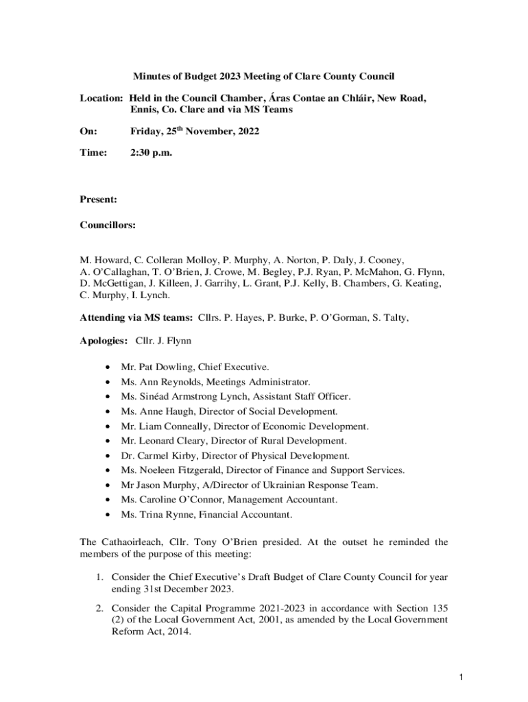 Minutes of Budget 2023 Meeting of Clare County Council Location: Held in the Council Chamber, RAS Contact a Chair, New Road, Tennis, Co. Clare and via MS Teams On:Friday, 25th November, 2022Time:2:30